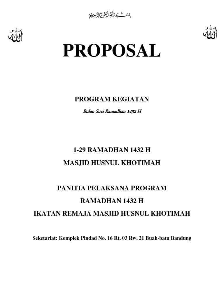 Contoh proposal kegiatan ramadan di sekolah; Budiw14.phbi/doc/2007 proposal kegiatan pesantren kilat smp negeri 14 depok 1428 h / 2007 m i. Pendahuluan bulan ramadhan adalah bulan yang . Rencana anggaran dana kegiatan pesantren kilat (sanlat) di madrasah . Proposal permohonan bantuan dana pembangunan aula tahfizh pondok pesantren al qur an hidayatul mustafid kh.moh.syahidin di ajukan kepada yth :